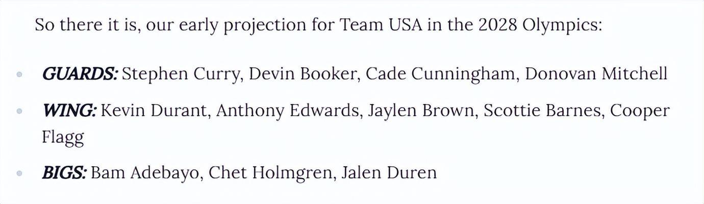 当然,这并非官方名单,未来两年在洛杉矶奥运开始前,很可能出现巨大变动。没人知道库里最终是否真的会出战,而健康状况显然会影响每一位竞争美国队名额的球员。