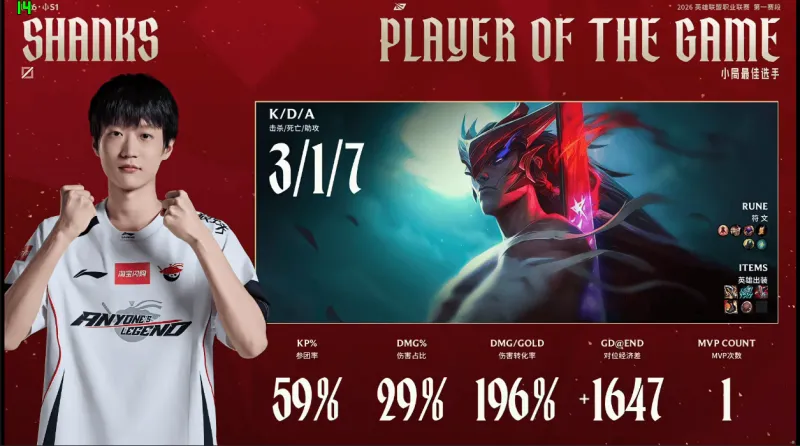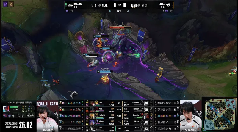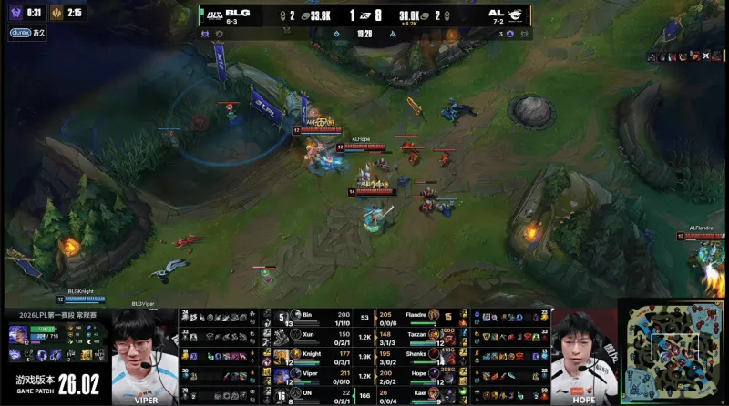26分钟,Tarzan强开Knight失败,BLG先后击杀Hope与Shanks